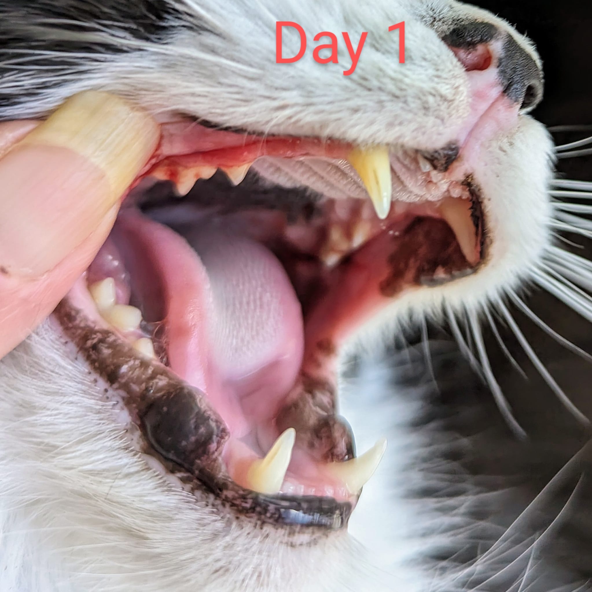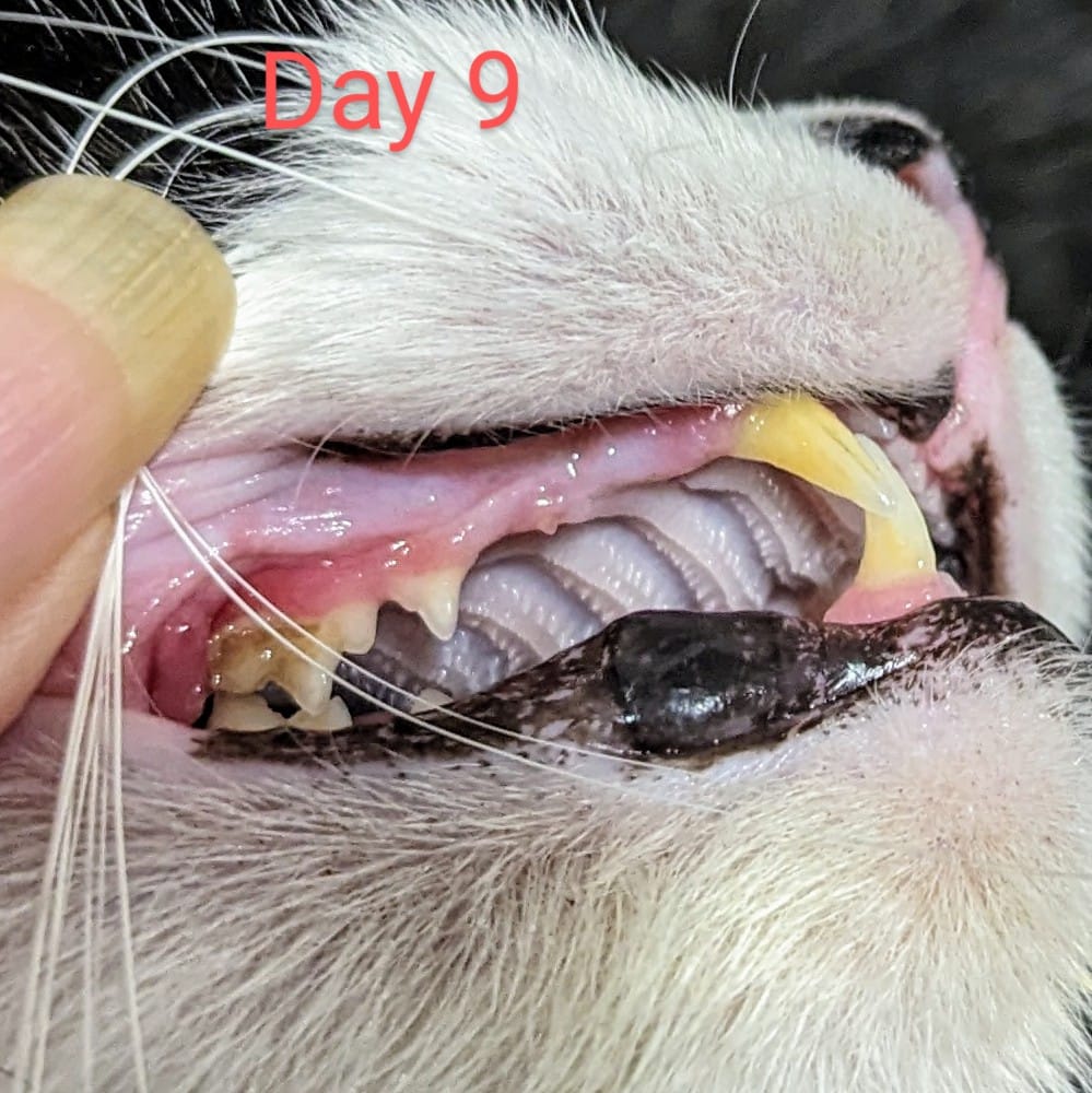This is my foster Jamison's first day on Mutoral 2. Progress so far with the first 2 weeks of treatment has been phenomenal! He's eating great, and back up to 9lbs from 7.5lbs the day we started. I'm going to have to order one more box of meds because of it! Lol. Even his veterinary dentist is impressed. Wish I could get decent pictures of the back of his throat to show off that improvement, but I'll take what I can get.