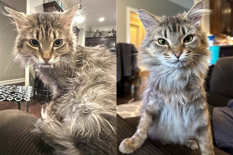 Fast forward to today (picture on the right), she is now 8 pounds! She eats ALL the time, even more than her much larger siblings. She meows, she purrs, she plays with toys (including biting them with her mouth and kicking with her back feet), she runs around with zoomies at times, no more drool, her coat is softer, fluffy again, and filling back in, and she just has energy we’ve never seen before. Plus, the back of her mouth is no longer bright red. She even leans into us to get cheek and under chin rubs (another thing she’s never done).