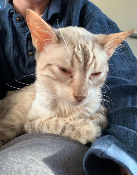 This is Ragnar. He’s also a Bengal, 7 months old. He’s Rossini’s brother. The vet has been treating him for calicivirus. The drainage from the URI stopped, but the oral lesion (on his tongue) has not healed, and he’s anemic/jaundiced (he’s normally a blue-eyed cat, but his irises turned yellow. Nobody had seen that before at our clinic.) He has lost a pound since his neuter a little over a month ago. He was doing well, then he wasn’t. We are trying! He had his first dose of Mutian this morning.