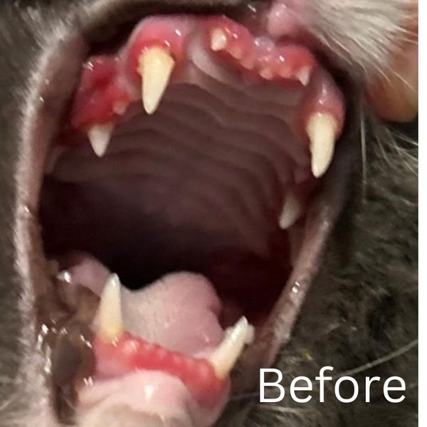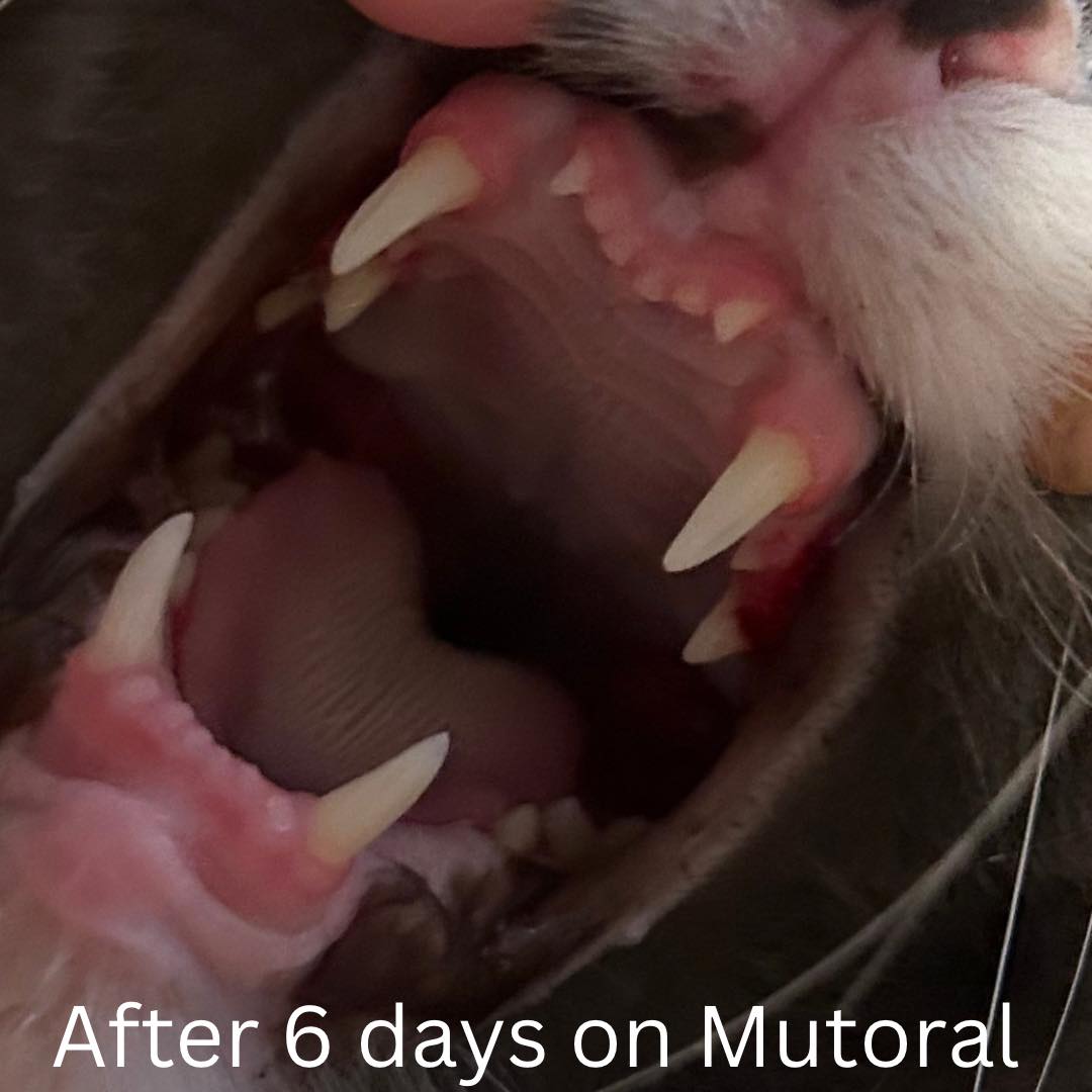 After doing some research, I found this group and I decide to try the treatment Mutoral, and after just 6 days on this new medication, I’ve seen a huge improvement! She’s eating again, has already gained 2 pounds, and she’s back to being her playful, happy self. The ulcers are healing, and the inflammation in her front teeth is completely gone. The back teeth are still inflamed, but we have 11 more weeks of treatment to go. I’m feeling hopeful and will keep you all updated on her progress!