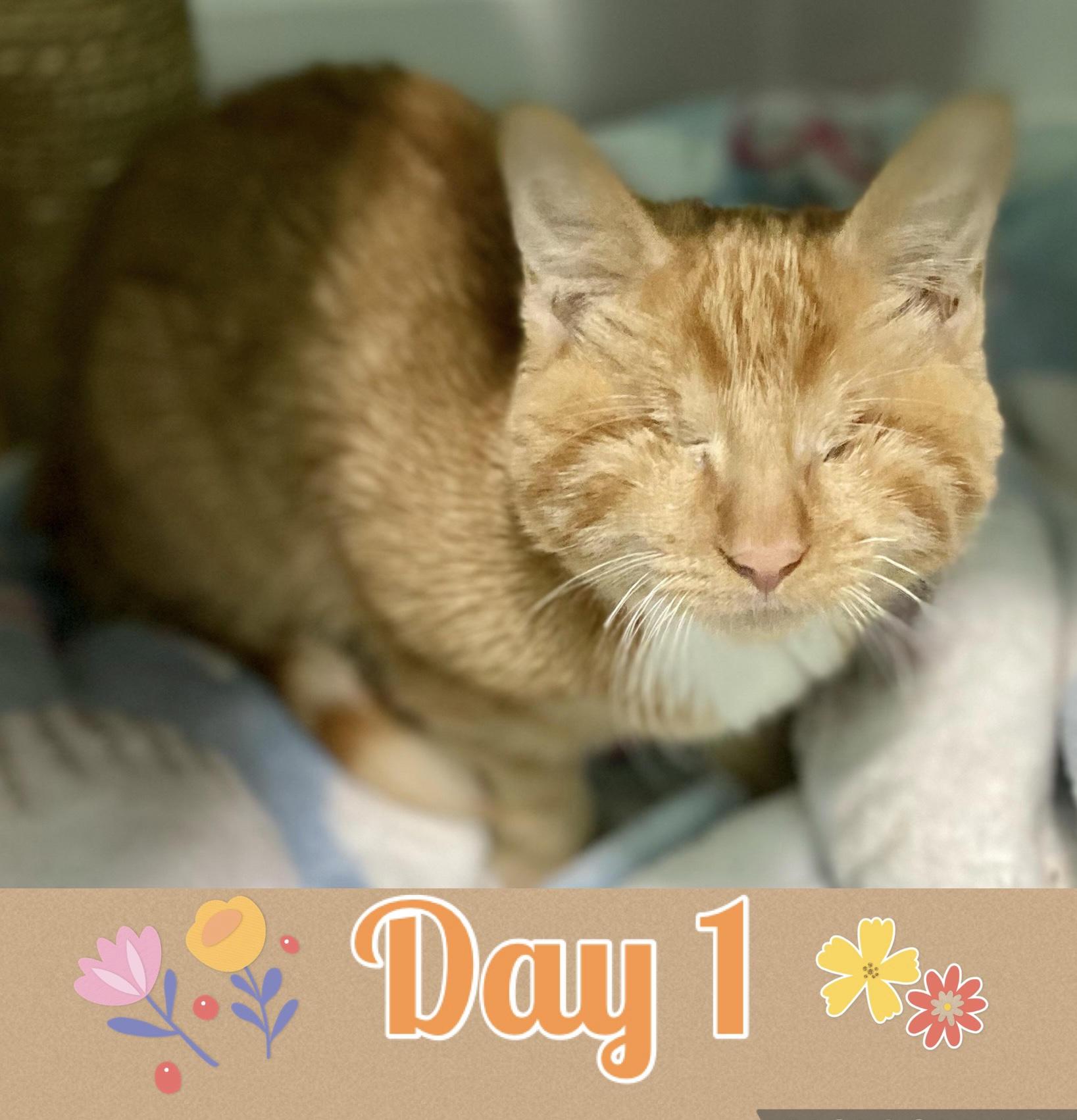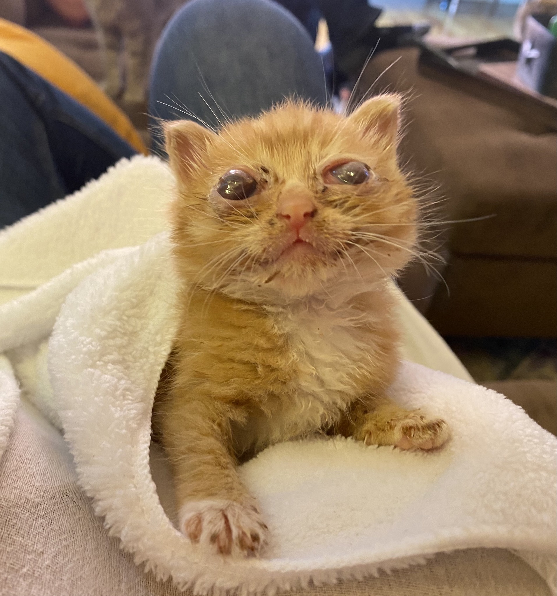 Since today is national “Kiss a Ginger” day, I want to share the story of my most favorite ginger girl of all time. Annie Lou’s story is one of courage, perseverance, and incredible resilience! She came into my rescue at just 3 weeks old, in October of 2021. Both of her eyes were so badly infected that they had already ruptured beyond saving. She was tiny, very sick, and literally hanging by a thread. Thankfully, the woman who found her rushed Annie to an emergency vet and they were able to stabilize her until I could go get her. Once in my care, she quickly began to eat, gain weight, and thrive. Her eye removal surgery was scheduled for January. Unfortunately, the pain became too much for her and we were forced to move it up a few weeks. In mid December, Annie had both eyes removed. Like before, she bounced back quickly and felt better than she had in her whole 2 months of life. She was even set to be adopted that following month by a dear friend.