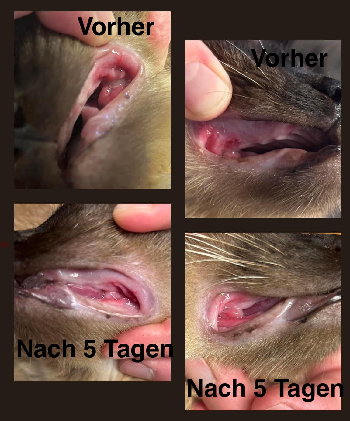 I have started the Mutoral-Treatment with my cat Piojin last week (see the top two pictures marked „vorher“). Unfortunately i had to start it alongside with dexamethason (cortisone), which is not recommended. I started tapering off the cortisone the same day by giving it only every second day instead of every day. Today is day 5 and the ulcers and swelling have already nearly totally disappeared and the inflammation has clearly began to subside (see the bottom two pictures marked „Nach 5 Tagen“).