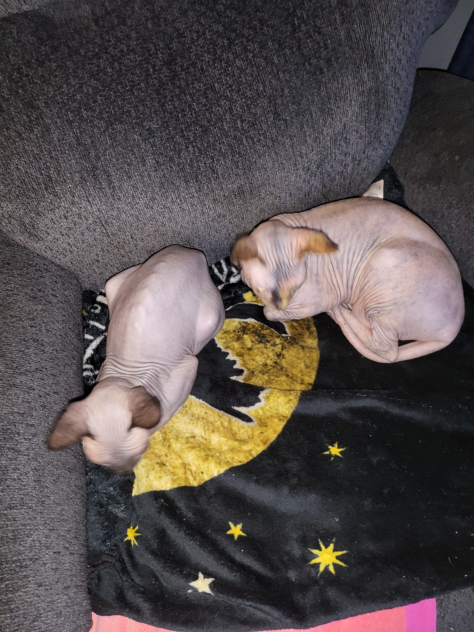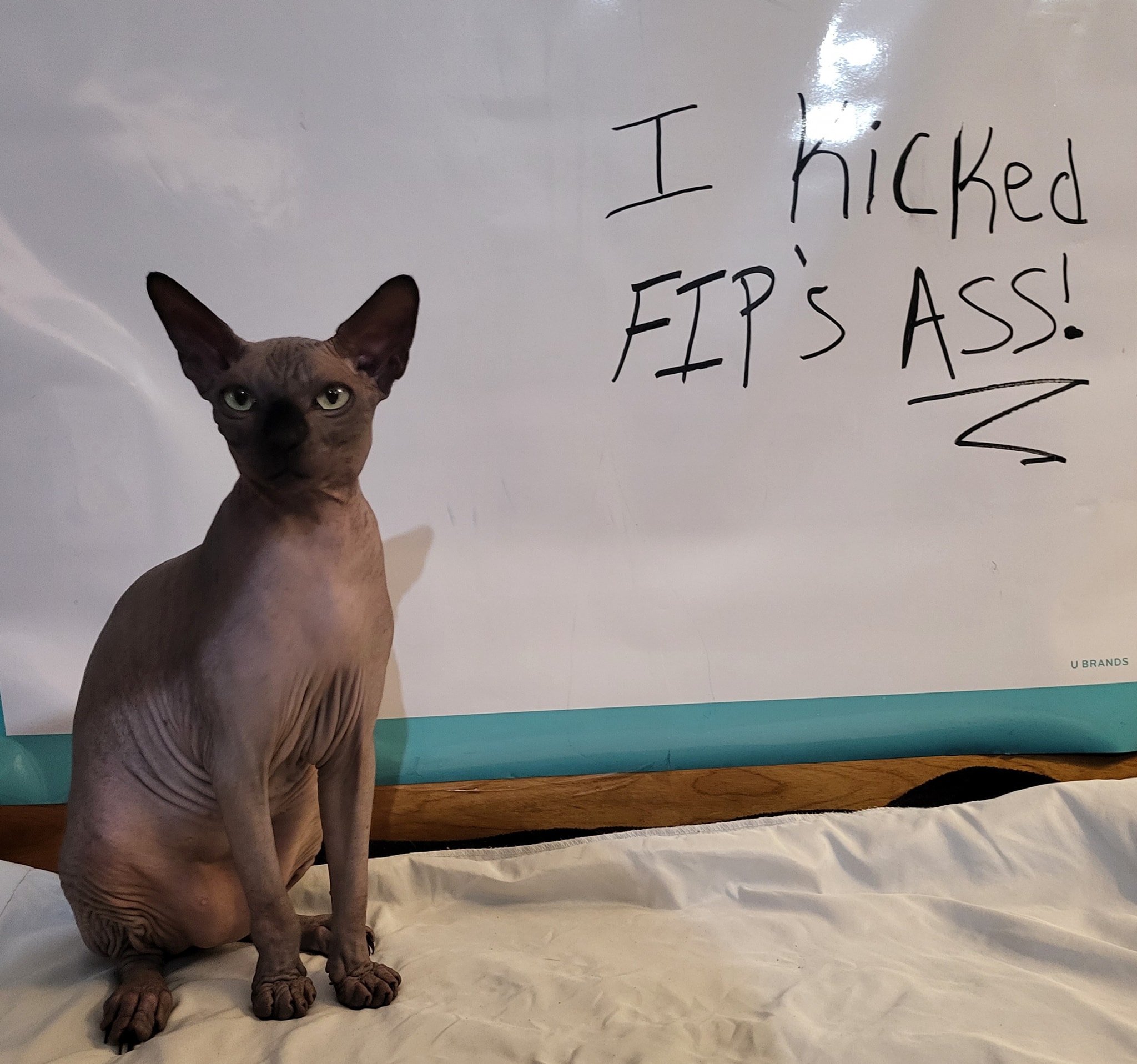 Trigger warning! Some of these pics are a little graphic! Long post ahead: Hi! I am going to be telling the story of my babies fip journey! I got 13(black sphynx) towards the end of October last year along with his sister Jinx. 13 was always so much tinier than his sister and never aged but I thought maybe that's just his personality and he's just a chill dude. Around April I noticed 13 getting skinnier even though he ate ALL the time and stole food whenever he could. April 15th my 13s belly was so swollen I knew something wasn't right. My friend is a vet tech so she came over and checked him out and said that he might have wet fip. She said if she puts a syringe in his belly and pulls fluid then he definitely does. So she did and my worst fear came true when I saw that syringe fill with fluid. I researched on the internet trying to figure out what to do and I came across a tik tok of a animal rescue who used a different Facebook group to get meds so I found that group and they had me start 13 on injections. The injections where horrible! The group told me I should see improvement within a week. I never did in fact 13 got worse! He started getting fluid built up in his legs, and bumps all around his body. The fluid in his legs would cause sores to show up and burst. He also had a mark on his back from his first injection that would not heal! April 26th 13 couldn't walk his legs where so swollen and he was in so much pain. I messaged the group and tried to find out what was going on only to be ignored. I went to a emergency vet that night thinking I was going to have to say goodbye to the sweetest most amazing little kitten who wasn't even a year old yet. We found out his liver was failing and the sores where infected and wouldn't heal because of the fip his body couldn't fight the infections. I posted one last post in a sphynx Facebook group looking for answers or a miracle idk what I was hoping the post would do but I just felt like I had to make it. Then I got a message from Lisa Ann Root telling me about mutation and how they saved her babies! Turns out she also lives near me so she was able to bring me some doses right away! 13 was on pain meds and antibiotics and mutation and within a week the fluid started to go away and the sores started to heal! I found out that the injections literally burned my baby from the inside out and they where killing him faster than the fip was. I am forever thankful for Lisa for introducing me to Nancy who has been extremely helpful and caring and just plain amazing! My baby was able to celebrate his 1st birthday July 11th and on July 17th he finished his treatment!! He is a brand new cat, he plays, he gets into trouble, he's still the sweetest most loving boy, you would never know by looking at him that he was on deaths door just a few short months ago!