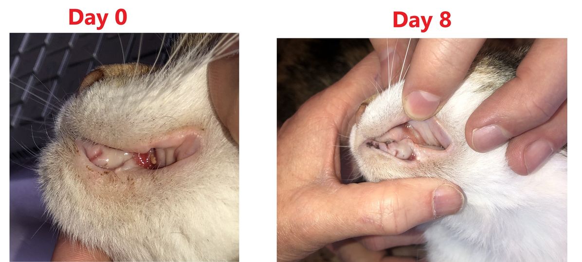 Here are pics comparing Molly's mouth after the first 8 days on Mutoral I. And she has gone from 6 1/2 to 8 pounds!!! She is still underweight, but we'll have to start watching it as time goes on! Quite a switch from high calorie food and supplements 4-6 times a day this past year only to watch her wither down to skin and bones.