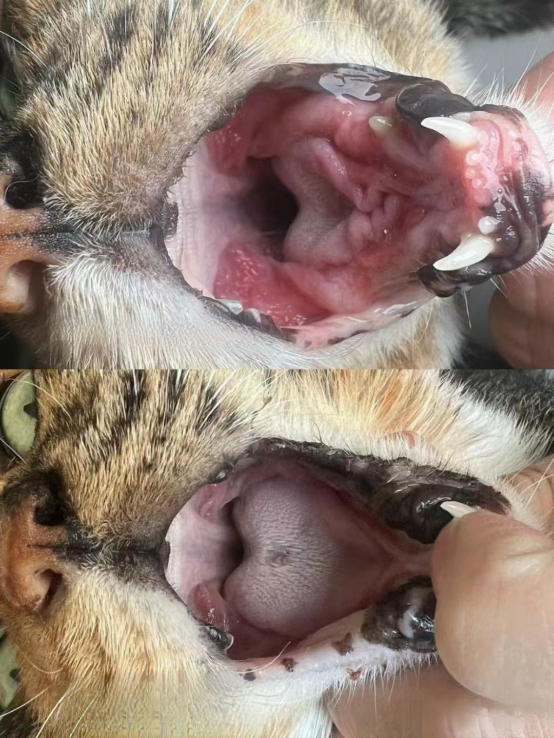 This cat is the first cat I have had with stomatitis. She is thirteen years old. She has been suffering from stomatitis for four or five years. She is so thin that she eats as little as she wants. Every day she is a hen squatting, and then look at the water does not drink. Mutoral ate two weeks, her mouth is better than before, are put out your tongue, inflammation also faded a lot, I've never seen such a tongue, before and after comparison chart can clearly see that it's amazing.