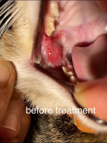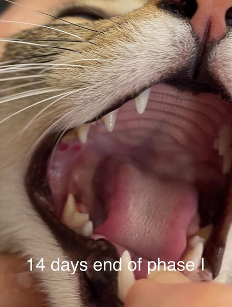 Here’s an update on our treating little Chi-Chi. 14 days into treatment, just finished Phase I and the vet agreed that the stomatitis resolved by 80%. So we are continuing with Phase II