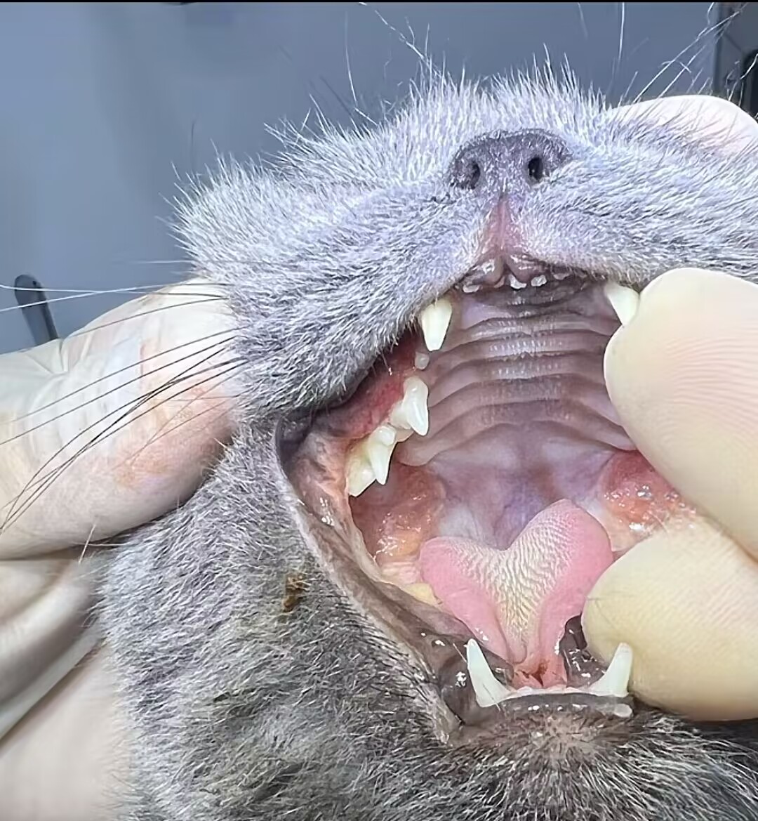 Look at the way Justin was drooling before, drooling and bleeding at the same time. I'm worried about him. I started Mutoral treatment for him a month ago, and the second picture is of his mouth recently. You can see that the redness and swelling are much better, and he is no longer drooling